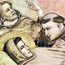 Cimabue (seconda galleria, secondi posti, non lontano da Dante): sorride sotto i baffi, guardando Giotto.